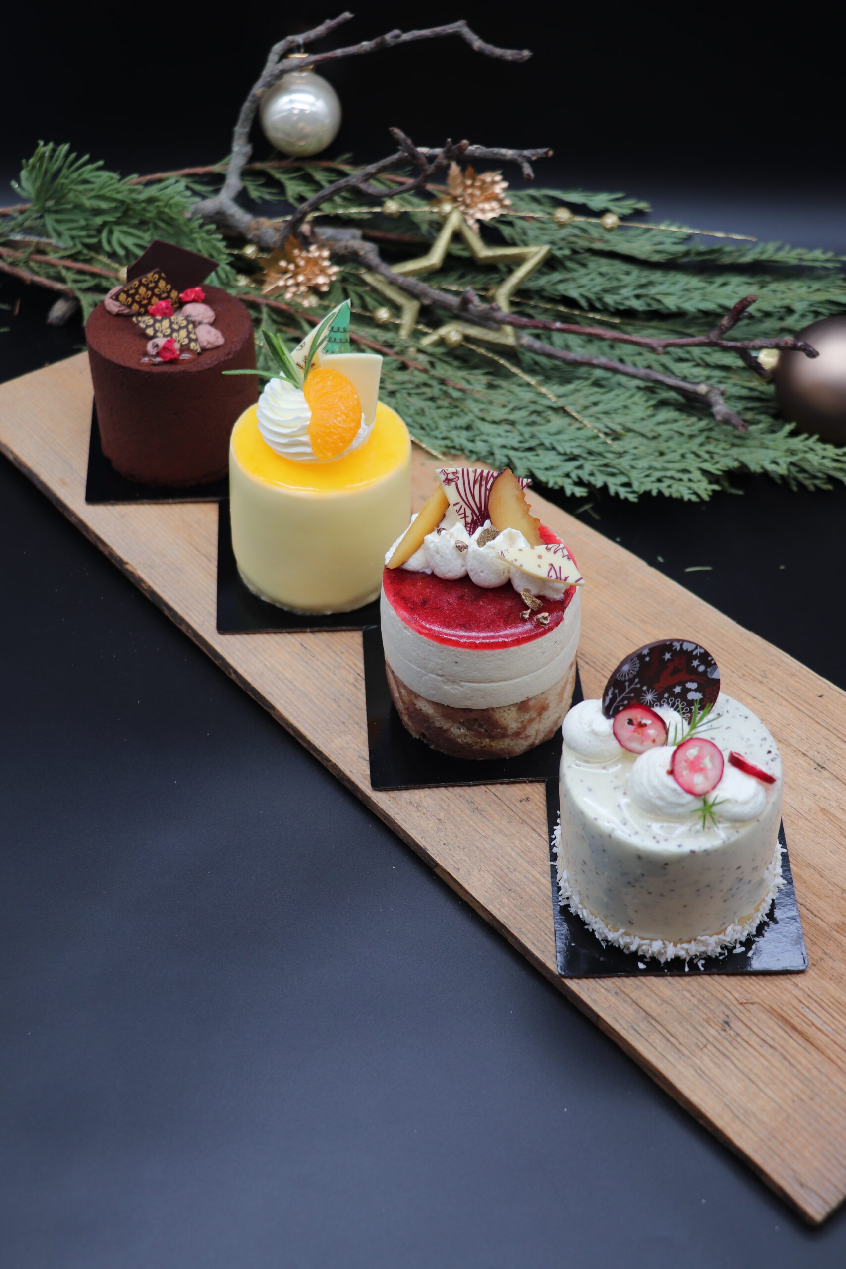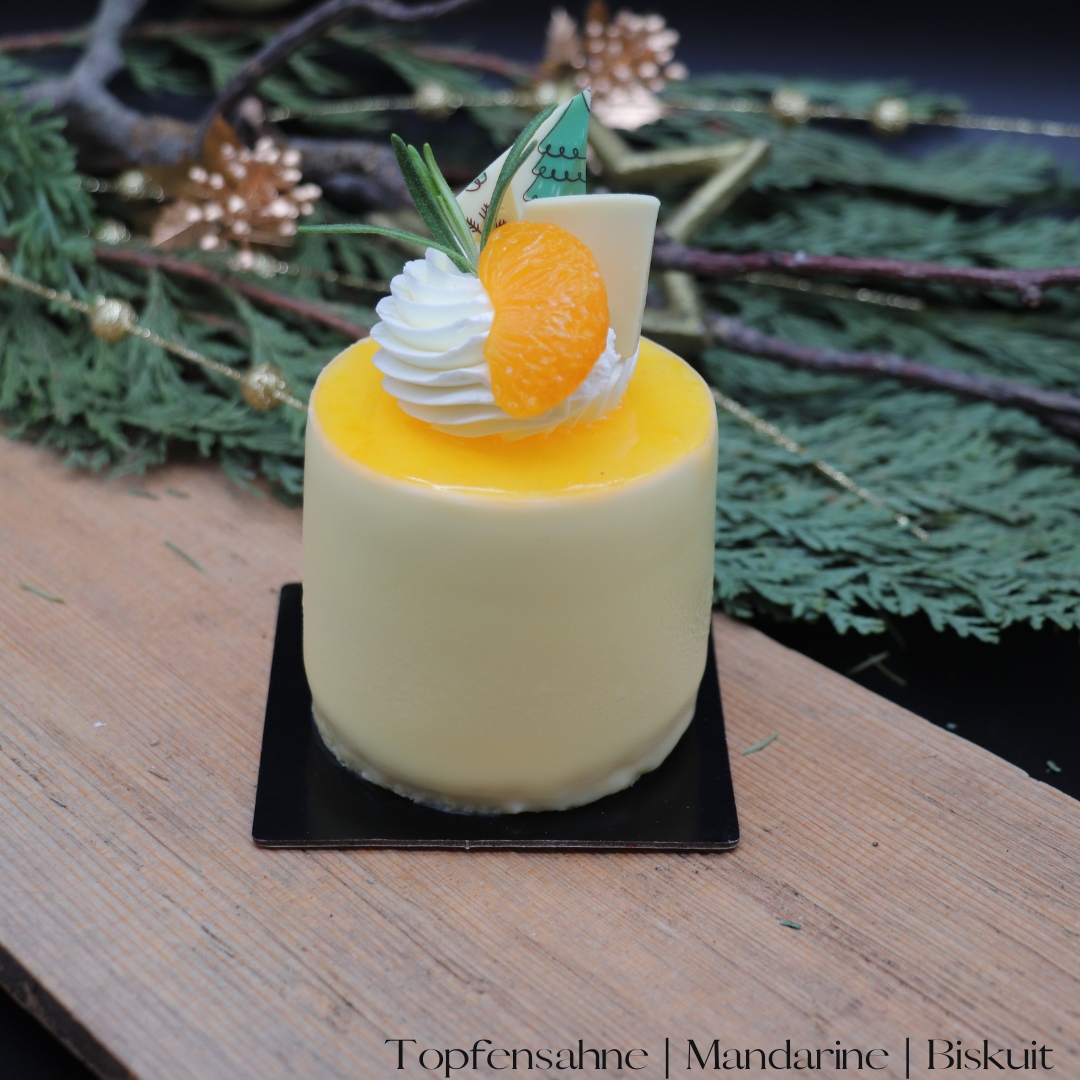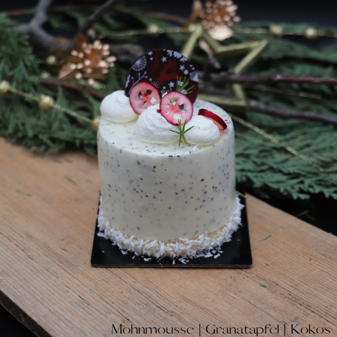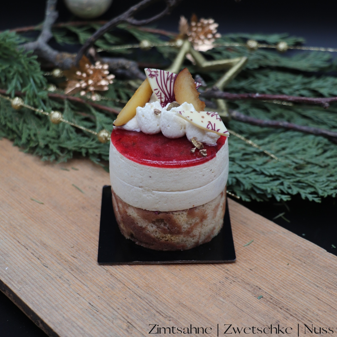 | Törtchen Nr.3 | Topfensahne-Mandarine, Zimtsahne-Zwetschke, Mohnmousse-Granatapfel, Schokomousse-Champagner |